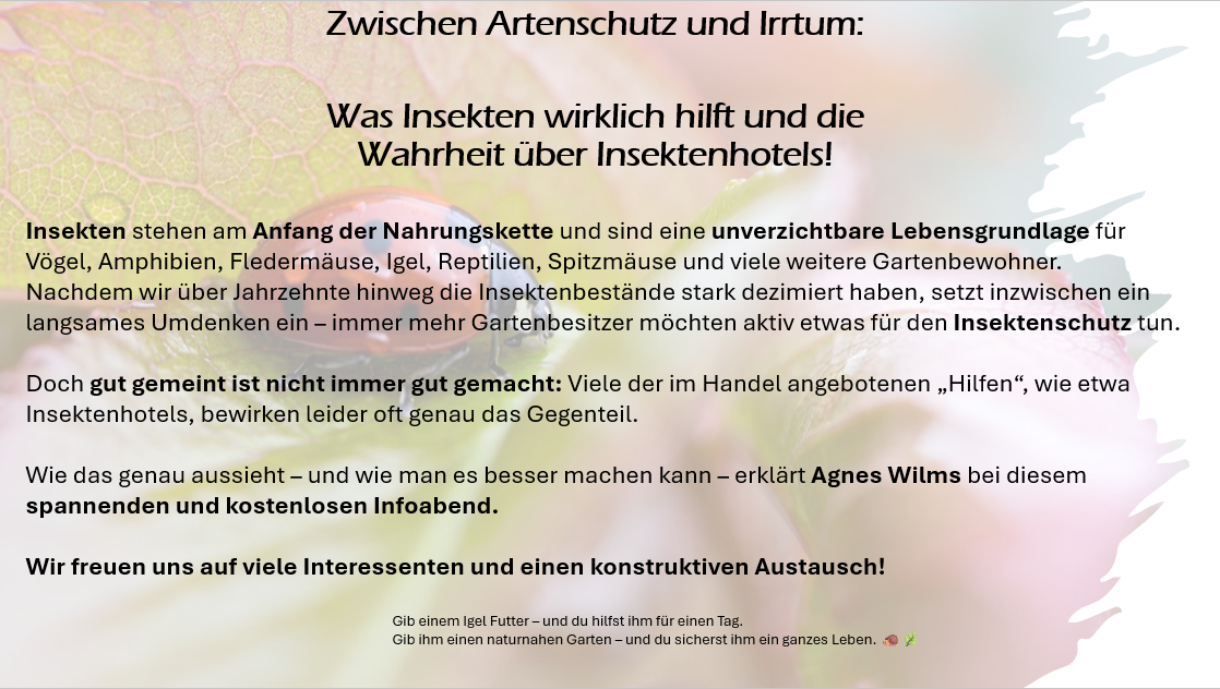 Doch gut gemeint ist nicht immer gut gemacht: Viele der im Handel angebotenen „Hilfen“, wie etwa Insektenhotels, bewirken leider oft genau das Gegenteil.