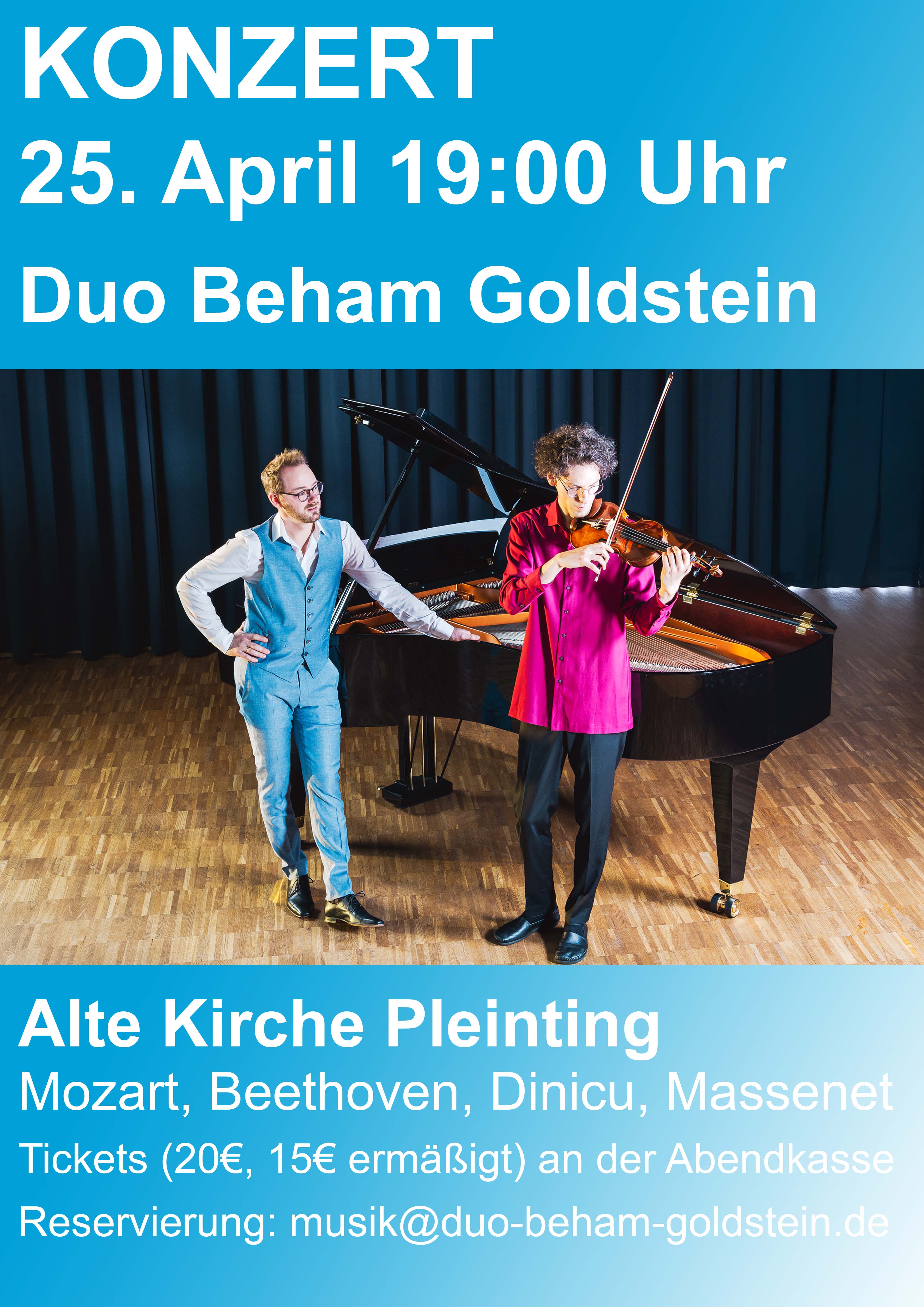 Christoph Goldstein (Violine/Viola) und Johannes Beham (Klavier) geben am Samstag, den 25. April 2026 um 19:00 Uhr ein klassisches Konzert in der Alten Kirche in Pleinting (Hauptstraße 34, 94474 Vilshofen an der Donau). Im Zentrum des Konzerts stehen die Sonate D-Dur KV 306 von Mozart, anlässlich des 270. Geburtstages von Mozart, der in diesem Jahr gefeiert wird, und die Sonate G-Dur Op. 30/3 von Beethoven, außerdem Werke von Dinicu und Massenet. Karten zum Preis von 20€ (15€ ermäßigt) gibt es an der Abendkasse, Kartenreservierung über musik [at] duo-beham-goldstein.de