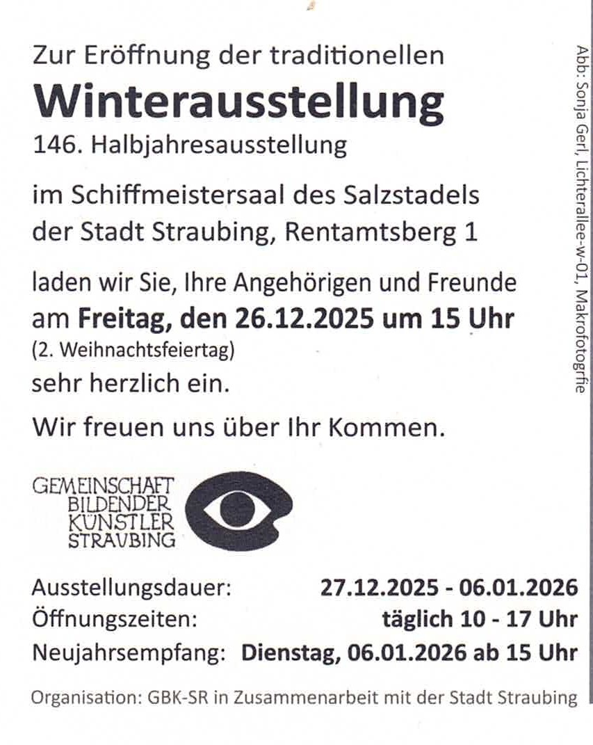 56 Maler, Grafiker, Bildhauer und Objektkünstler aus dem ostbayerischen Raum werden in 96 Werken ihre unterschiedlichen persönlichen Kunstauffassungen und künstlerischen Aussagen in der Sammelausstellung im Schiffmeistersaal im Salzstadel in Straubing präsentieren.