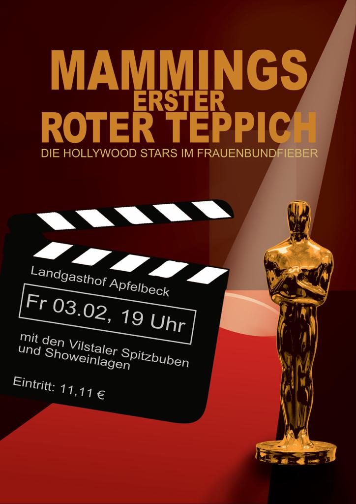 Heuer kann der Frauenbundfasching endlich wieder stattfinden. Unter dem Motto "Mammings erster roter Teppich" wird ab 19:00 im Gasthaus Apfelbeck getanzt und gefeiert. Wir freuen uns auf euch.
