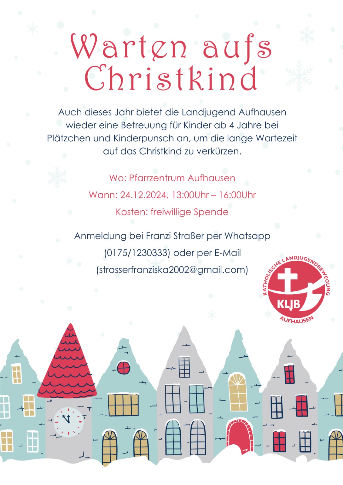 Wie jedes Jahr bieten wir, die KLJB Aufhausen, eine Betreuung für Kinder ab 4 Jahren an, um die lange Wartezeit auf das Christkind zu verkürzen.