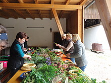 Unter Anleitung binden die Teilnehmer die mitgebrachten Blüten und Blätter zu einem dekorativem Werk.