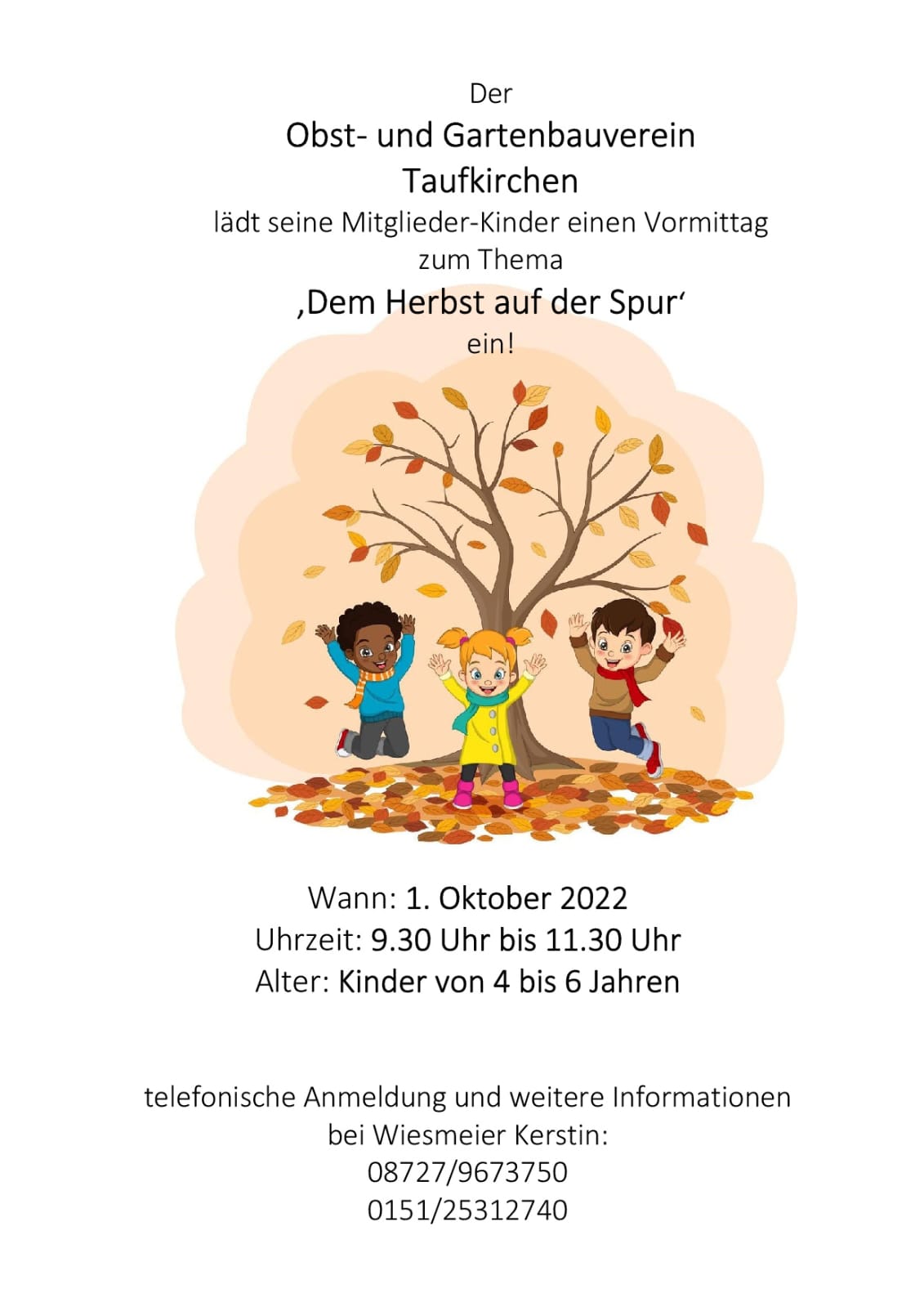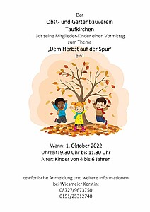 Wir laden die Kinder unserer Vereinsmitglieder im Alter von 4 bis 6 Jahren ganz herzlich ein, gemeinsam mit uns einen Vormittag zum Thema "Dem Herbst auf der Spur" zu erleben.